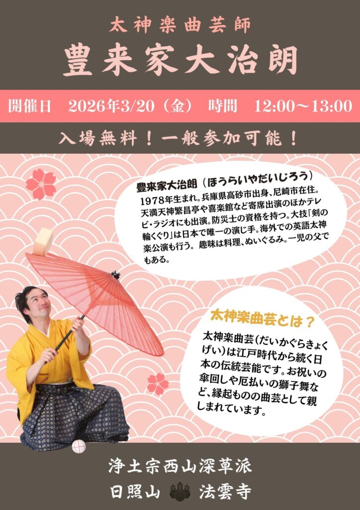 今回のご講師は、昨年法雲寺講座で講師を勤めて下さいました、僧侶兼落語家である露の五九洛(昨年12月に、露の団姫から露の五九洛へ改名をされました。)氏のご主人である、太神楽曲芸師の“豊来家大治朗氏”をお招きしました。